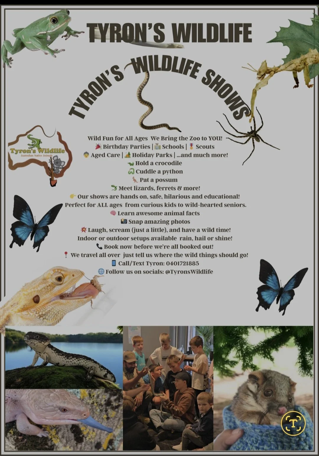 Tyron’s Wildlife can do a show anywhere as long as we have appropriate space out of weather.